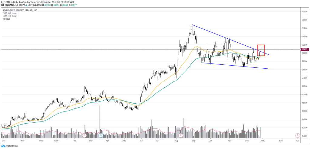 Anglogold also has a price closely correlated with the gold price, as can be seen in the similarity in the shape of their charts. ANG looked like the weaker one of the two from the get to, as during the forming if it’s decending pennant formation over the last couple of months it has spent a lot of time beneath its 30 day EMA.